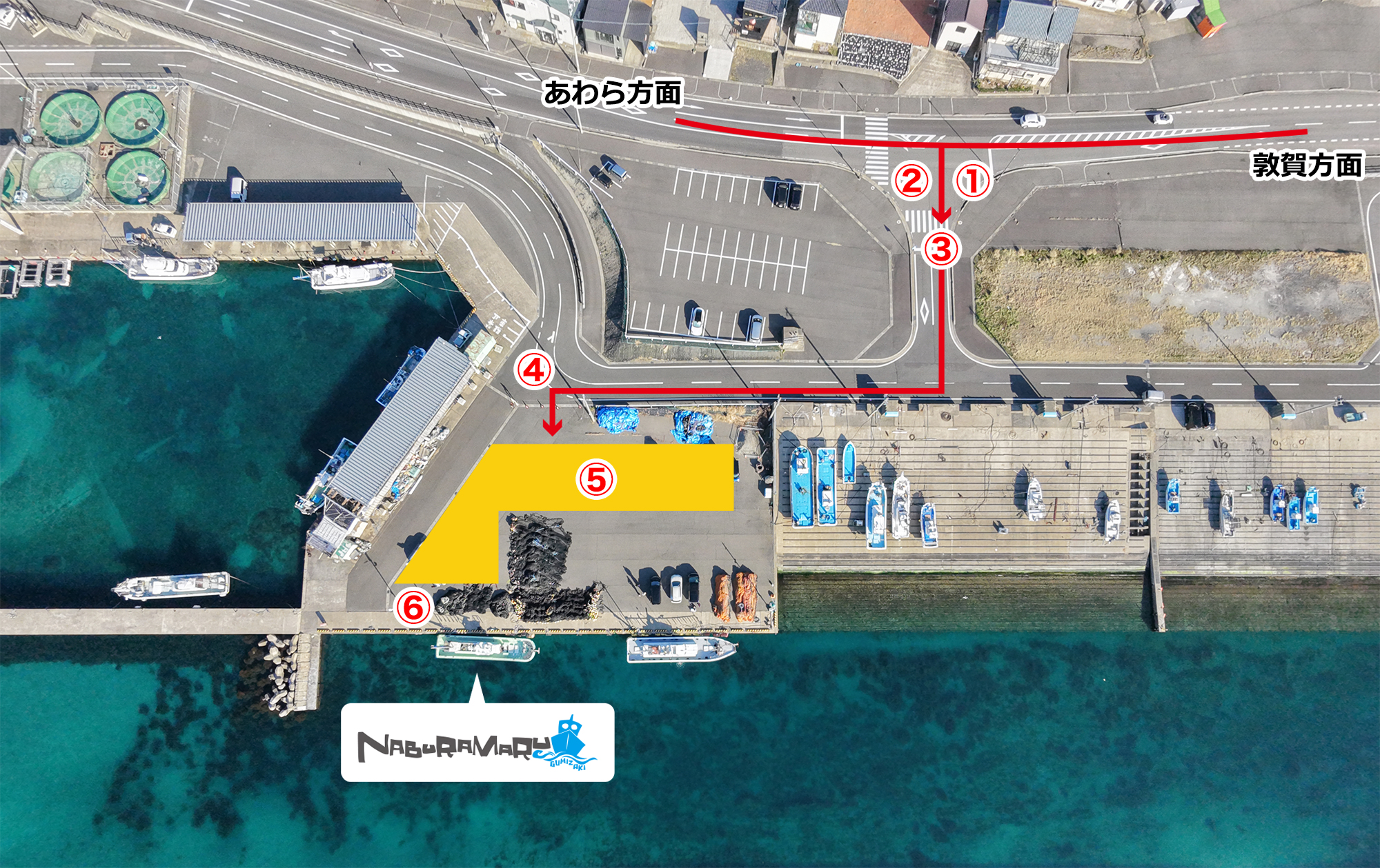 福井県福井市茱崎町13-113 小玉旅館さんを目指してお越しください。 駐車場は無料です。 富山方面:金津ICから約40km、約60分 名古屋、大阪方面:敦賀ICから約50km、約70分①敦賀方面から左折②あわら方面から右折③突き当たりを右折④駐車場入口⑤駐車場⑥集合場所トイレについて集合場所から車で5分の公共トイレをご利用ください。